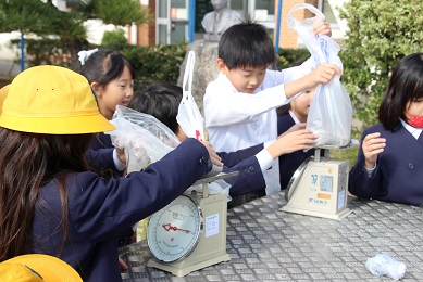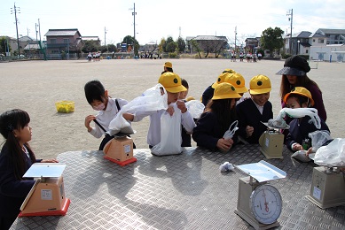 3年生の算数では、重さをはかりを使って量る学習をしています。今日は、3クラス(少人数指導ですので、2クラスを3クラスに分けています。)一緒に1kgがどれくらいの重さなのか、砂を袋に詰めました。予想とは全く違った子もいたようで、何度も砂を増やしたり減らしたり…。早く終わった子の中には、ほかの子と協力して8kgの砂を袋に集めている子もいました。はかりの読み方、これでばっちりですね。