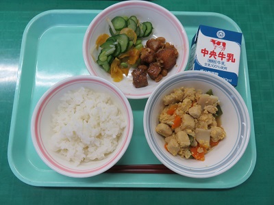 ごはん、牛乳、まぐろと大豆の甘辛揚げ、高野豆腐の卵とじ、きゅうりの即席漬け