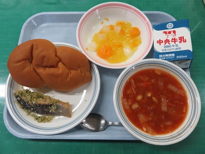 クロスロールパン、牛乳、鮭の香草焼き、トマトスープ、ナタデココとみかんのゼリー