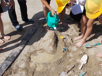 年生理科】流れる水の働きを調べる学習を行いました。砂場に河川のモデルを作り、そこに実際に水を流して、斜面が削られたり砂が運ばれたりする様子を観察しました。