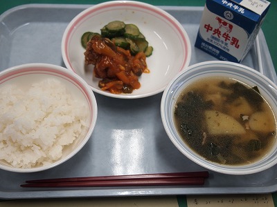 今日の献立は、カラフルすどり、きゅうりのかおり和え、わかめスープ、ごはん、牛乳でした。