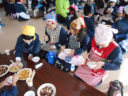 今日の1~3時間目、3年生が藤浪コミュニティへ出掛けました。地域の方々、保護者の方々に協力していただき、もちつきの体験をさせていただきました。小さな体で重い杵を持ち、一生懸命に餅をついていました。つきたての餅をいただき、食べている笑顔は格別でした。