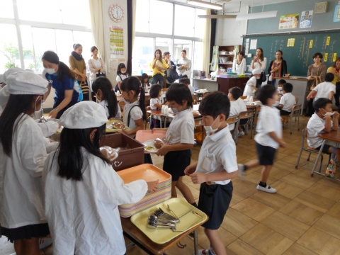 1年生の給食の様子を参観した後、PTA保健委員会の皆さんが配膳をしてくださった給食をいただきました。本日のメニューは、