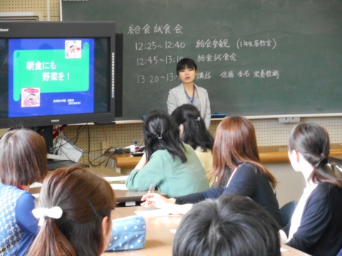 久しぶり?の給食をおいしくいただいた後は、栄養教諭の佐藤先生から、『朝食にも野菜を食べよう』と題して、講話をいただき、野菜の摂り方について学びました。