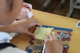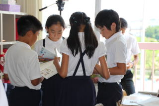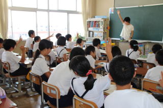 単元は国語の「時計の時間と心の時間」という説明文でした。春望の暗唱から始まり、国語スイッチを入れた後、授業が展開されました。筆者の考えを的確に読み取り、筆者の意見に対してどう思うか、自分の意見をまとめ、小グループで意見交流をしました。授業へ臨む集中力、積極性、自分の意見を書くことに熱心に取り組む姿勢は素晴らしいものでした。意見を伝え、その意見に対して班員全員が呼応する、とても良い雰囲気の授業でした
