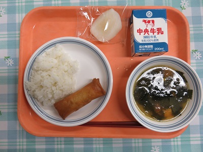 ごはん、牛乳、春巻き、わかめスープ、梨