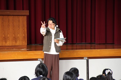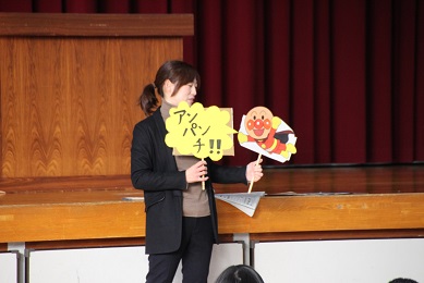 交通安全担当の村木先生からは、グリーンベルト(歩道のない道にある緑に塗られた場所)を使って安全に登下校することと、地域の方と上手に道路を使って登下校することについてお話がありました。