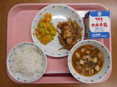 今日は「かみかみ献立」。せん切りのごぼうに片栗粉をまぶして、油で揚げました。大人でも噛み応えがある料理でしたが、1年生も喜んで食べていたという報告を聞いて、安心しました。
