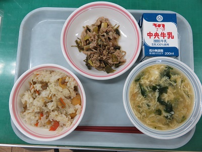 秋の香りごはん、牛乳、豚肉と越津ねぎのうまとろ煮、愛西三つ葉のかき玉汁