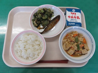ごはん、牛乳、高野豆腐のたまごとじ、ニジマスの甘露煮、磯香和え