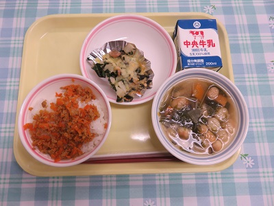 ごはん、牛乳、にんじんとツナのふりかけ、里芋とモロヘイヤのチーズ焼き、玉麩汁