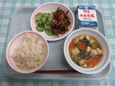 金芽ロウカット玄米ごはん、牛乳、豚肉とごぼうの揚げ煮、梅の香和え、あさりとあおさのりの澄まし汁