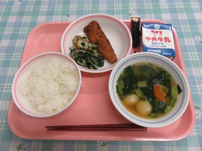 ごはん、牛乳、コーヒー牛乳のもと、飛び魚の竜田揚げ、磯香和え、じゃがいも団子汁