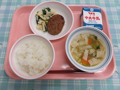 ごはん、牛乳、和風おろしハンバーグ、かけあえ、ゆばとめかぶの澄まし汁
