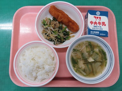 ごはん、牛乳、イカフライのレモン煮、おかか和え、ちゃんこ汁