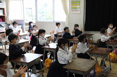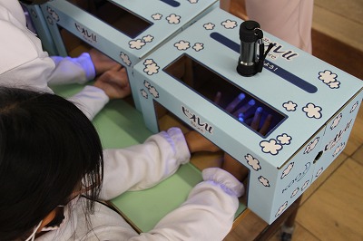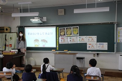 今日は1年生で手洗いに関する保健指導を行いました。特別な薬を付けた後で実際に手洗いをし、ブラックライトで照らすと、洗い残しが白く光って見えました。どこに気をつけて手洗いを行えばいいかを、みんなで確認することができました。
