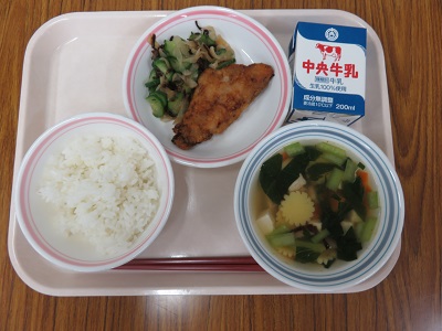 ごはん(新米)、牛乳、トロアジの竜田揚げ、塩昆布和え、重陽の節句汁