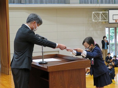 今日は1年半ぶりとなる児童集会を行いました。児童会役員の進行で、児童会長による朝のあいさつや、書写コンクールの表彰、校長先生のお話、全校児童による校歌、児童会からのお知らせ等を行いました。