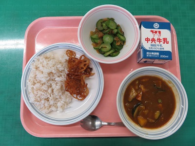 麦ごはん、牛乳、かぼちゃとズッキーニのカレー、れんこんチップス、福神和え