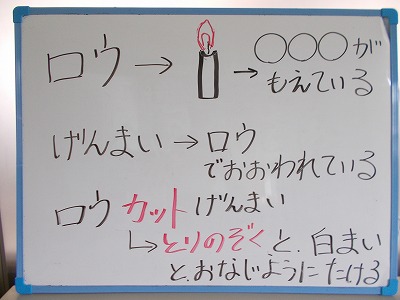 「ろうそく」のイメージから「ロウ」を説明しようと考えたのですが、「ろうそく」そのものを、身近に感じられていないようです。「ケーキに立てて火をつけるやつ」という言葉を加えたことで、うなずく児童が増えました。