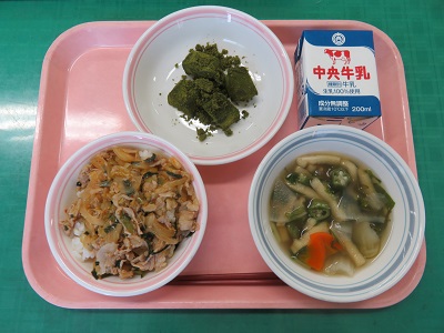金芽ロウカット玄米ご飯、牛乳、豚キムチ丼、オクラのとろとろ汁、抹茶わらび餅