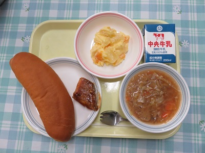 ロールパン、牛乳、メバルのデミグラスソース、野菜たっぷりコンソメスープ、フルーツカスタード