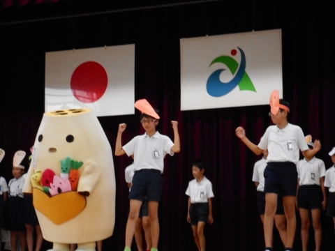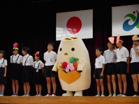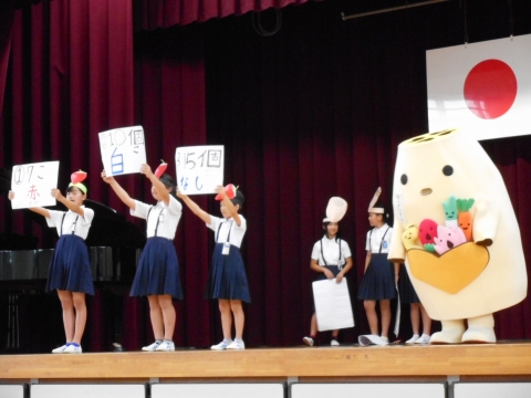 給食委員会のみなさんが、「あいさいさん」の友達の野菜たち、イチゴ、ネギ、ショウガ、ニンジン、レンコンがもつ力をクイズや劇を交えて楽しく教えてくれました。