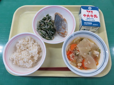 金芽ロウカット玄米ごはん、牛乳、鰆の柚子塩麴焼き、春大根のそぼろ煮、ほうれん草としらすのなめ茸和え