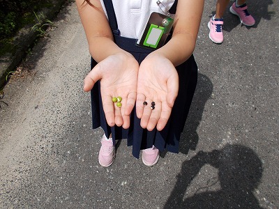 中休みの時間、南館のフウセンカズラの周りに子どもたちが集まってきました。「先生がいる時はたねをとってもいいよ。」と言うと、それぞれが風船状の実から種を取り始めました。茶色くなった実の中を開けると、ハート型の模様のついた黒い種が出てきました。まだ緑の実を開けると、緑の種が出てきました。休み時間でしたが、子どもたちは一生懸命種を集めたり、実の中を観察したりしていました。実の中にたねがあるかな?中をみると、黒や緑のたねが…。きれいなたねがとれました!