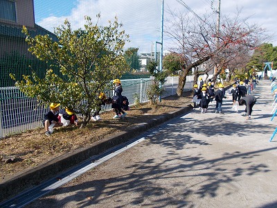 今日は1年生が図工のお面づくりに使うための落ち葉拾いを行いました。子どもたちは植え込みの下に落ちている色々な落ち葉を探して、ビニール袋に集めました。