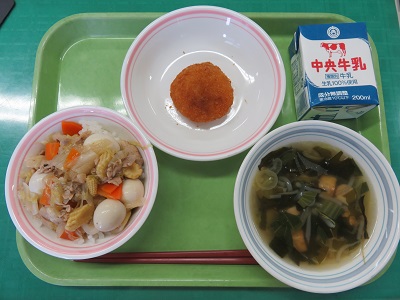 春野菜の中華丼(ごはん、中華丼の具)、牛乳、えびカツ、チンゲン菜のスープ