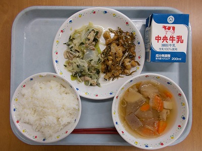 ご飯 牛乳 かえり大豆 えのきとベーコンの炒め物 具だくさん汁