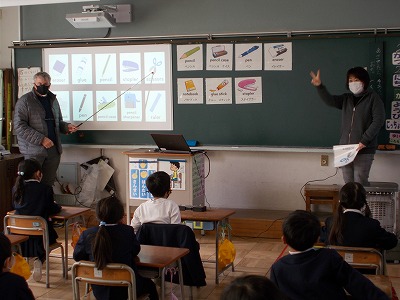【1年生外国語活動】 ALTの先生と一緒に、いろいろな文房具の英語を勉強しました。ハサミについては、多くの子が「ロック・シザース・ペーパー」のシザースだと気付き、元気に発音していました。