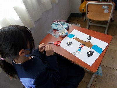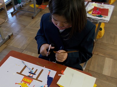 【2年生図画工作】 自分で考えた絵に、シールの色紙を切って貼りました。この後、水に浸して紙をあて、色紙の色を紙に写して色版画を作る予定です。