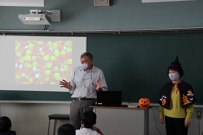 1年生の英語の授業で、ハロウィンについて学びました。先生がハロウィンの衣装を実際に着て見せたり、ALTの先生がハロウィンに関する英語の絵本を読んだりして、楽しく学ぶことができました。