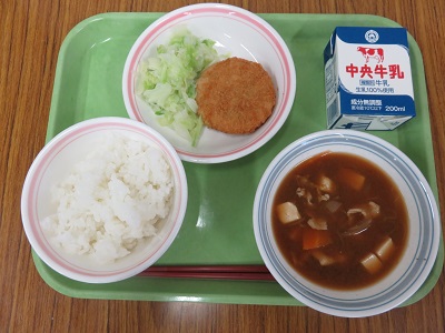 ごはん、牛乳、里芋コロッケ、ゆでキャベツ、豚汁