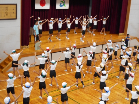 体育委員会の児童が舞台に上がってお手本になり、「愛西のびのびストレッチ」の練習をしました。