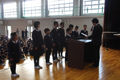 今日は夏休みに取り組んだ、「あいさいさん☆給食コンクール」、「交通安全ポスター」、「赤い羽根の書道とポスター」、「献血ポスター」の入賞者の表彰がありました。給食コンクールについては、なんと、1月の献立に採用されるそうです。1月の献立が楽しみですね。