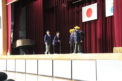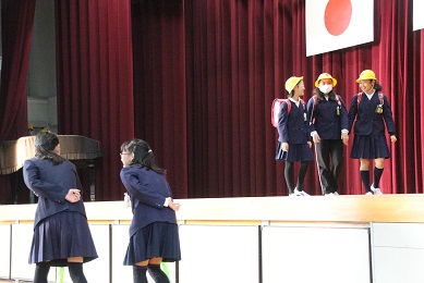 また通学団長から、登下校時の道路の通行について呼びかけがありました。通学路になっている道路は、生活する人みんなが気持ちよく利用できるように、周りを見て歩くようにと劇を通して呼びかけました。