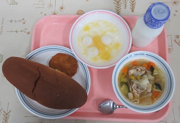 黒ロールパン、牛乳、枝豆コロッケ、夏野菜のポトフ、白玉入りマスカットゼリーポンチ