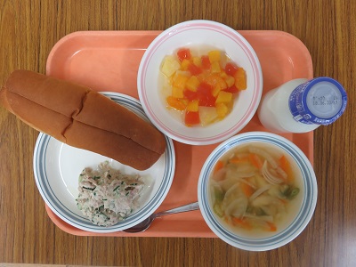 ツナサンド(サンドロール・ツナサンドの具)、牛乳、野菜スープ、愛知のゼリーカクテル