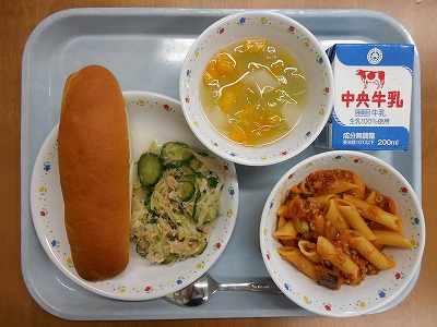 愛西市の給食で人気がある、「小型ロールパン」と「ペンネ料理」の組合せです。わりとボリュームがあるのですが、それぞれのペースで食べすすめています。笑顔がうれしいですね。