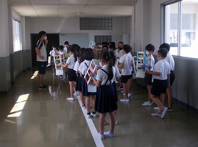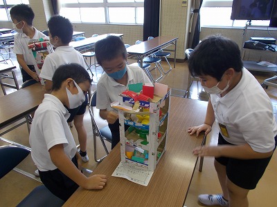 今日の5時間目は、4年生が2年生を招待し、図工で作成した「コロコロガーレ」(ビー玉を穴に通して下に落としていくおもちゃ)で2年生に楽しんでもらう授業を行いました。4年生は事前に2年生に宛てて招待状を渡し、当日は順番にやってくる2年生に自分の「コロコロガーレ」の遊び方を教えました。2年生は目を輝かせて、ビー玉をうまく穴に入れて下に落とそうと一生懸命でした。(校長先生も挑戦しました。)4年生は2年生に優しくやり方を教えたり、「こっちがあいているよ」と声をかけたりするなど、上級生らしい素晴らしい姿が見られました。