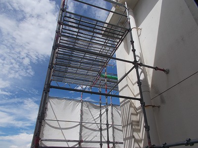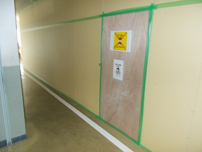 トイレ工事の場所は、パネルで囲われています。パネルの角には、ぶつかってケガをしないよう緩衝材が設置されています。トイレの外側には1階から3階にかけて足場が組まれ、作業を行う人たちは外から作業現場に入ります。