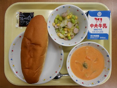 ミルクロールパン 牛乳 ブルーベリージャム キャベツの彩りサラダ にんじんポタージュ