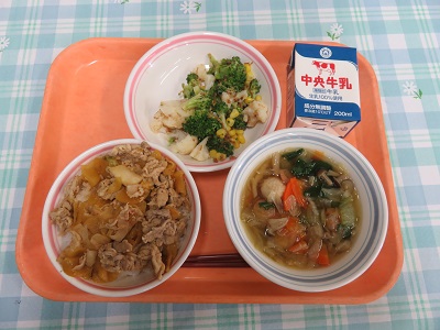 キムタク丼(麦ごはん、キムタク丼の具)、牛乳、花野菜のおかか和え、えびと春雨のスープ