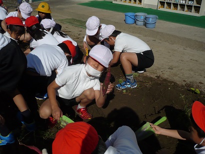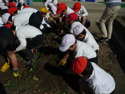 1・2年生が初夏から育てていたサツマイモ畑。収穫の時期となり、2日(水)と今日の2日間で、いもほりを行いました。市場の野菜と同じく、今年はどうも大きなサツマイモはできなかったようでしたが、その分一生懸命に探さないとなかなか見つからなかったようです。毎日世話をした野菜を調理し、みんなでいただく予定です。