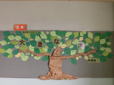 6年生の学年掲示板には、学年目標でもある大きな木の掲示をしました。その葉の一枚一枚にそれぞれの児童が6年生としての姿を想像して思いを書き込みました。