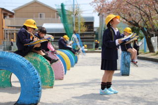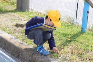 2年生の生活科の授業で、運動場に出てきた2年生。春を見つけようと、草花を絵に描いたり、様子を文で表していました。今日はデッサン、次は色を塗って華やかにするそうです。暖かい風が吹き、春を感じながらの授業でした。