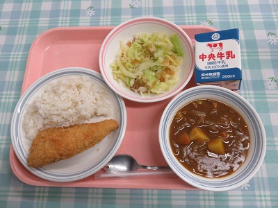 ごはん、牛乳、カレーライス、白身魚フライ、福神和え